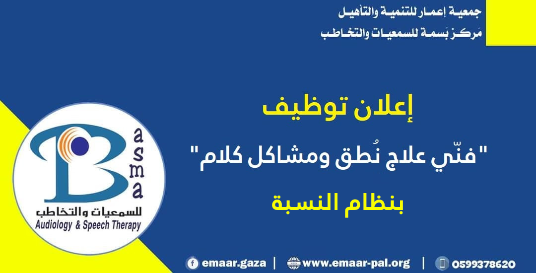 يُعلن مَركز بسمة للسمعيات والتخاطب التابع لِجمعية إعمار للتنمية والتأهيل عن حاجته لِشغل وظيفة (فني علاج نطق ومشاكل كلام) بنظام النِسبة، وفقًا للشروط التالية: