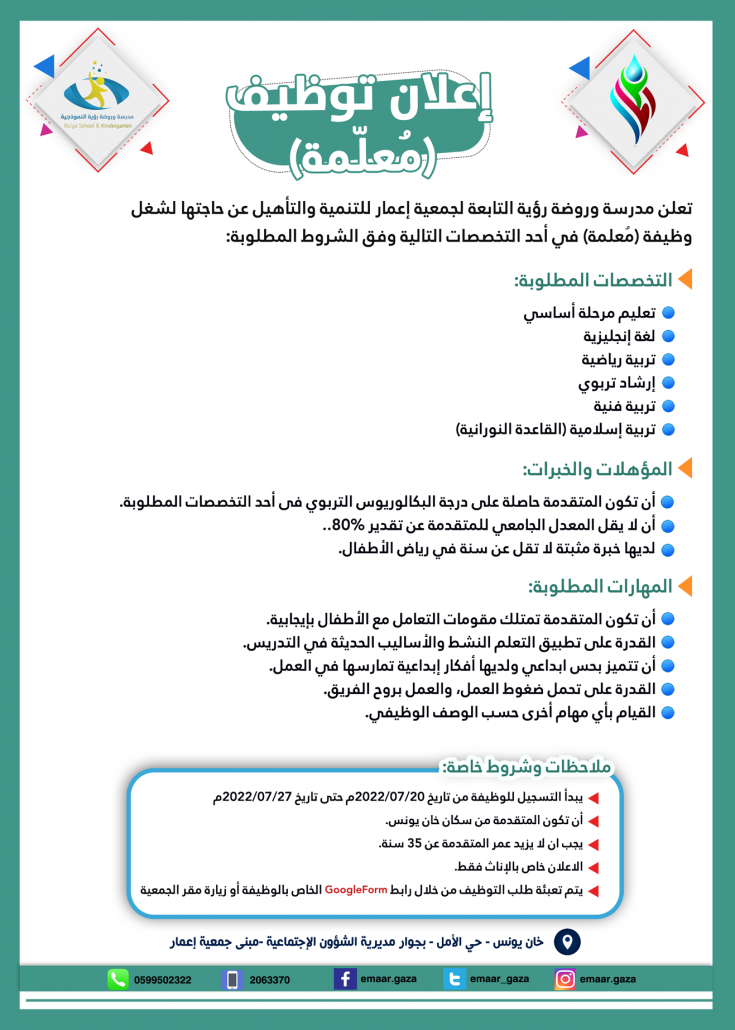 تُعلن مدرسة وروضة رُؤية النموذجية التابعة لجمعية إعمار للتنمية والتأهيل عن حاجتها لشغل وظيفة (مُعلّمة)، في أحد التخصصات التالية: