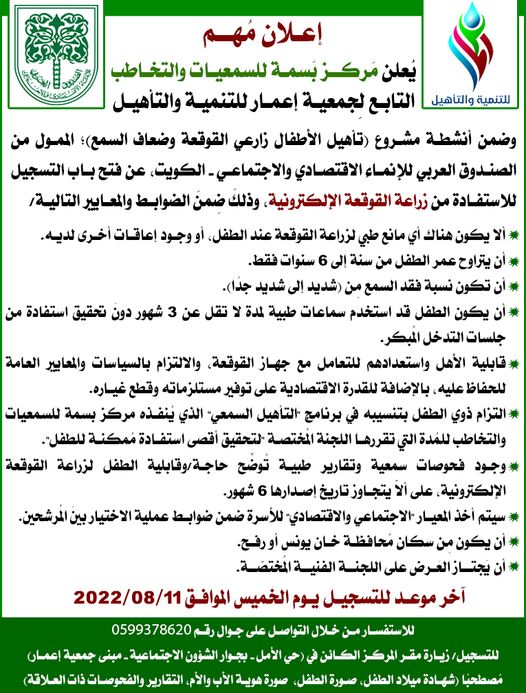 تعلن جمعية اعمار للتنمية والتأهيل عن طرح مناقصة (توريد وزراعة جهاز القوقعة الإلكترونية) ضمن إطار مشروع تأهيل الأطفال زارعي القوقعة وضعاف السمع –معونة رقم (19 HS/24) بتمويل من: مؤسسة الصندوق العربي للإنماء الاقتصادي والاجتماعي-الكويت